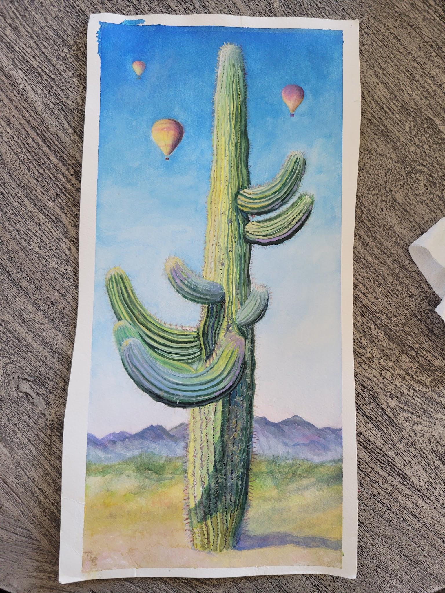Water gouache painting of hot air balloons over a desert cactus landscape. 8x17 inches on paper. $395. Created in 2025.